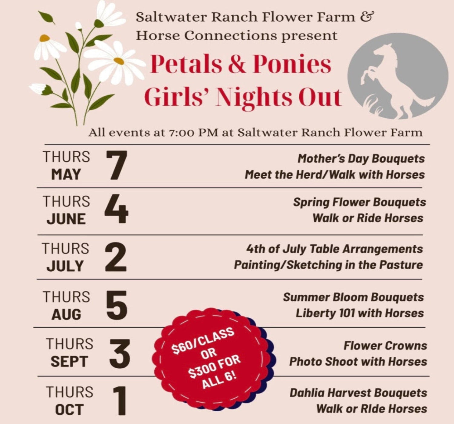 Choose one night or join us for multiple evenings of flowers, horses, & connection at Saltwater Ranch Flower Farm.